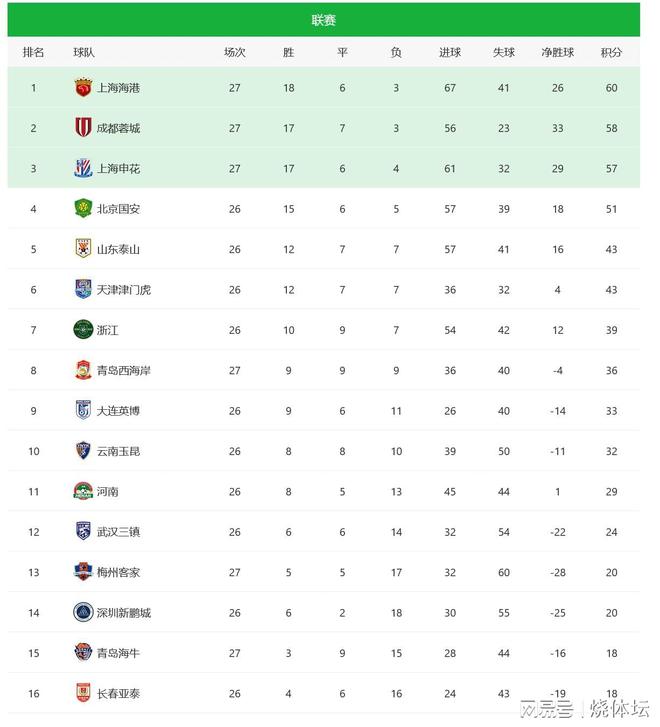 北京时间10月17日晚,2025年中超联赛第27轮三场比赛拉开帷幕。本轮成都成都主场击败梅州客家,上海申花客场击败青岛西海岸,上海港也客场击败青岛海牛拿到3分。中超积分榜上,上海港、成都成都和上海申花均拿到3分。争冠形势与上一轮相比没有太大变化,主动权依然掌握在上海港手中。下一轮,上海港将客场挑战山东泰山。如果上海港能够跨过这一关,则很有可能成为本赛季的联赛冠军。成都成都和上海申花过去都错失了很多机会。目前来说,拉比斯他们还不愿意接受这样的局面。不过,没有主动权,他们就只能等待海港出手了。同时,他们还必须保护自己的记录。此外,北京国安目前落后榜首多达9分,此时逆袭夺冠的希望十分渺茫。成都荣成3-1梅州客家 成都荣成在五粮液文体中心足球场进行比赛。第18分钟杨明阳进球1-0领先,但第25分钟罗德里戈进球将比分扳平。此后第70分钟莱切特进球,第82分钟罗慕洛进球,成都成都下半场连进2球保持3分。成都 成都主场全取3分,将总积分提升至58分,仍落后榜首上海港2分。梅州客家未能清分。球队整体形势相当复杂,保级压力依然巨大。青岛西海岸1-2上海申花 青岛西海岸 本场比赛在青岛西C队进行东大学城体育场。第13分钟,派恩斯进球取得领先。第20分钟,吴曦主罚点球破门,帮助上海申花扳平比分。此后,孙杰在第38分钟因严重犯规被红牌罚下。第45分钟,张呈栋奋力拼抢,甘舒然也被红牌罚下场。青岛西海岸赛前派出了两名球员。第58分钟,于汉超头球破门,上海申花取得领先。上海申花此役全取3分,取得联赛2连胜。总积分增至57分,仍排名第三。青岛西海岸的三连胜已经结束,前十位置比较稳定,这段时间的整体表现可圈可点。青岛海牛3-4上海海港 青岛海牛在青岛青少年足球场进行比赛。第11分钟,兰克尔破门,1-0领先。第14分钟,加布里埃尔破门帮助尚海海格比赛。第31分钟,莱昂纳多进球帮助上海黑格取得领先。此后,兰克尔在第37分钟再次进球,帮助海牛扳平比分。第40分钟莱昂纳多梅开二度,帮助哈伯重新取得领先。第89分钟,李新祥进球帮助锁定胜局。第90分钟和第5分钟,宋文杰为海牛扳回一球。上海黑格客场没有惊喜,取得联赛4连胜。目前总积分已增至60分,并继续获得肯定。青岛海牛未能拿分,继续深陷降级区,本轮末段面临垫底。