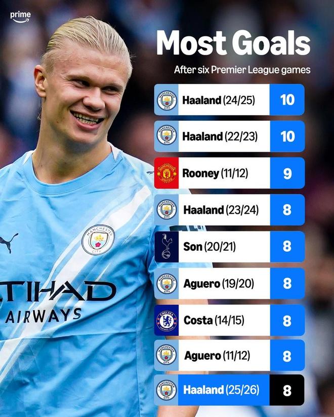 在本赛季英超联赛的前六场比赛之后,海兰命中率8球。根据统计数据,英超历史上有9次,球员在本赛季的前六场比赛中至少得分8次。