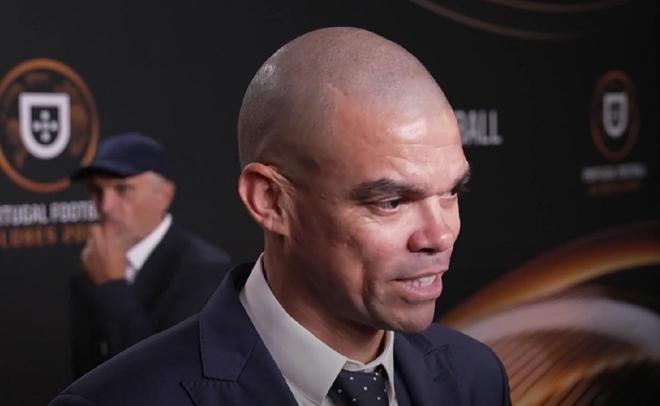 前葡萄牙国脚佩佩在葡萄牙足球金球奖颁奖典礼上接受记者采访。受邀谈论葡萄牙国内足球的诸多话题,包括
