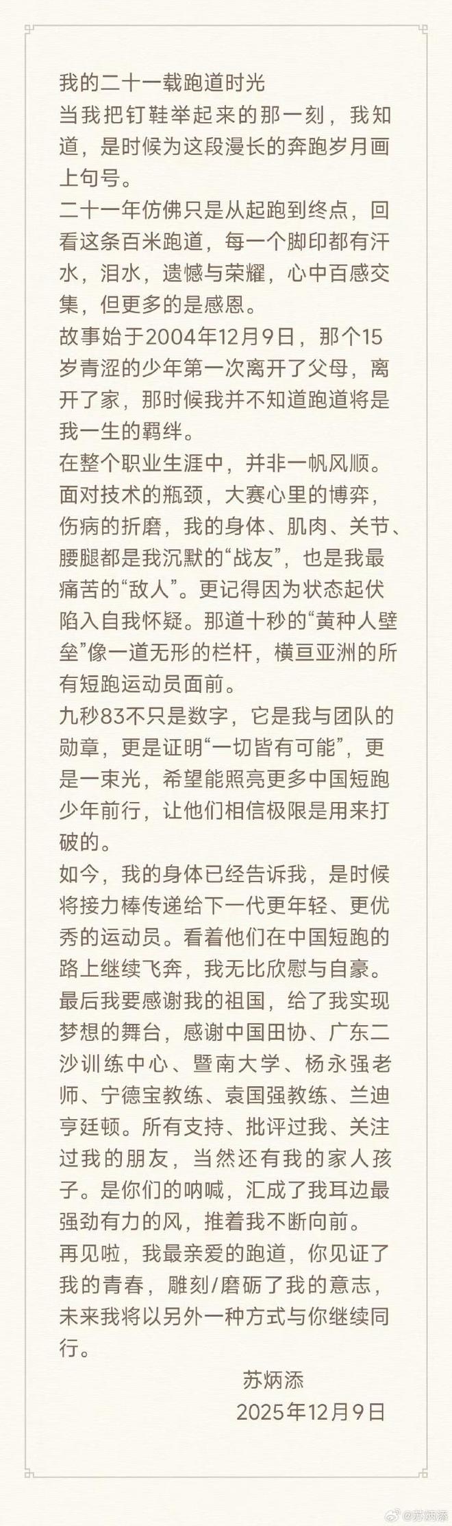 12月9日,中国男子100米亚洲纪录保持者苏炳添宣布退役。 12月9日,苏炳添在个人账号上发布长文《我的田径二十一年》:苏炳添,1989年出生于中山市古镇镇,初中时就开始接触短跑。 2004年11月,15岁的苏炳添首次参加正式比赛——中学比赛和田赛,并以11.72秒(完赛时间)的成绩获得100米比赛第一名。自2009年首次入选国家队以来,苏炳添已代表中国田径队参加了三届奥运会和六届世锦赛等国际比赛。代表中国队获得2015年北京世界田径锦标赛男子4×100米接力银牌、2020年东京奥运会男子4×100米接力铜牌。这这是中国男队在世界大赛上获得的仅有的两枚奖牌。职业生涯中,苏炳添多次突破百米10秒大关,刷新亚洲纪录。 2015年5月31日,在美国尤金举行的国际田联钻石联赛男子100米决赛中,苏炳添以9.99秒的成绩获得男子100米第三名,成为第一位真正在正常风速下突破9秒大关的亚洲运动员。 2021年8月1日东京奥运会100米半决赛,苏炳添团体排名第一,以9.83秒的成绩进入决赛,刷新亚洲纪录,成为首位进入奥运会100米决赛的中国运动员。本次全国赛,苏炳添在家乡完成了职业生涯的收官之战。早在第十五届全运会开赛时,苏炳添就多次提到自己只会参加接力项目,全运会将是他职业生涯的最后一次。今年2月,苏冰田在个人社交账号上发文称,“当我想起20年前第一次室内比赛时,过去的一切都成了回忆。我会继续努力恢复身体机能,力争在家乡第十五届全运会上站到最后的位置。” 10月17日,苏炳添在社交媒体上发文称,自己完成了职业生涯最后一次100米比赛。全运会,他将走入最后的角色。 11月20日晚,第十五届全国运动会4×100米决赛在广东奥体中心体育场举行。比赛中,苏炳添、刘洪熙、石俊豪、陈冠峰先后首发。广东队跑出38.71秒的成绩,最终排名第四。苏炳添打完了职业生涯最后一场比赛。比赛结束后,苏炳添绕场走动,向观众告别。采写:南都n视频记者 刘继贤