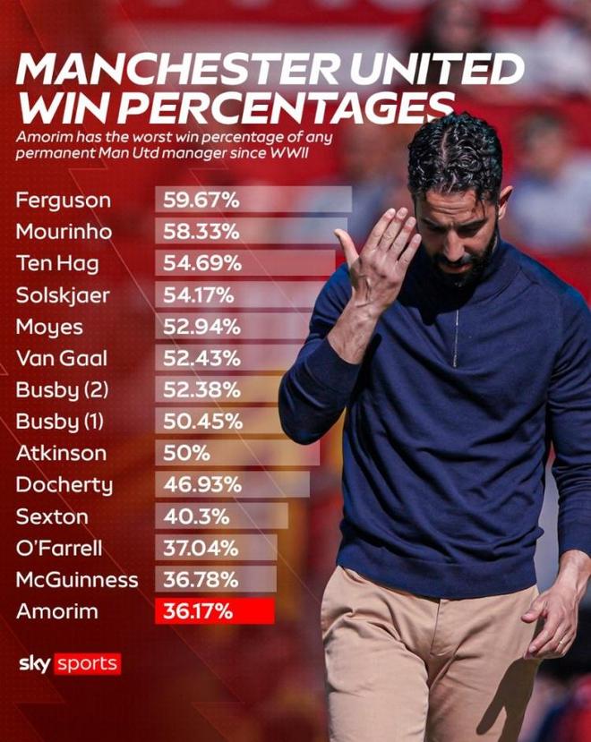 9月15日直播。曼联的教练阿莫林(Amorin)在曼城德比(Manchester Derby)消失了0-3之后。自从曼联的教练职位获得以来,葡萄牙队一直无法像外界所期望的那样踢足球。根据Sky Sports统计,Amorin是自第二次世界大战以来获胜率最低的总教练。以下是曼彻斯特的获胜教练率的排名:弗格森爵士:穆里尼奥爵士:59.67%:58.33%tenhach:54.69%Ole Gunnar:54.17%Moyes:52.94%van Gaal:52.43%的爵士:52.43%的Busby爵士(第二次教练):52.38%Coach Busby(first Busby:50%:50%:50%:50%:50%:50%:50%:50%:50%:50%:50%:50%:50%:50%:50%:50%:50%:50%:50%:50%:50%:50%:50%:50%。 SEXON:40.3%O'Farrell:37.04%McGuinness:36.78%Amorin:36.17%